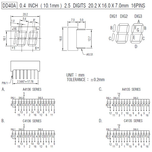DD40A: 0.4 INCH, 2.5 DIGIT 16 PINS